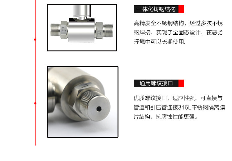 SIN-6100系列一體化差壓變送器采用OEM硅壓阻式差壓充油芯體組裝而成。外殼為全不銹鋼結(jié)構(gòu),兩個壓力接口為螺紋連接,可直接安裝在測量管道上或通過引壓管連接。