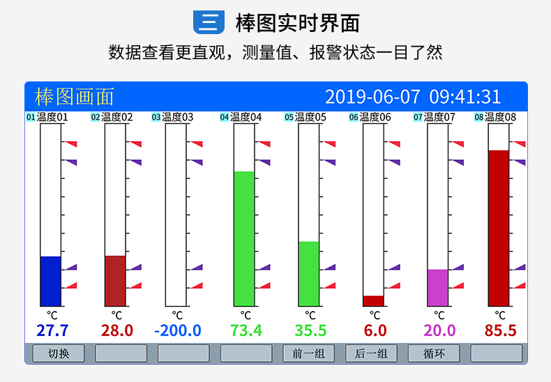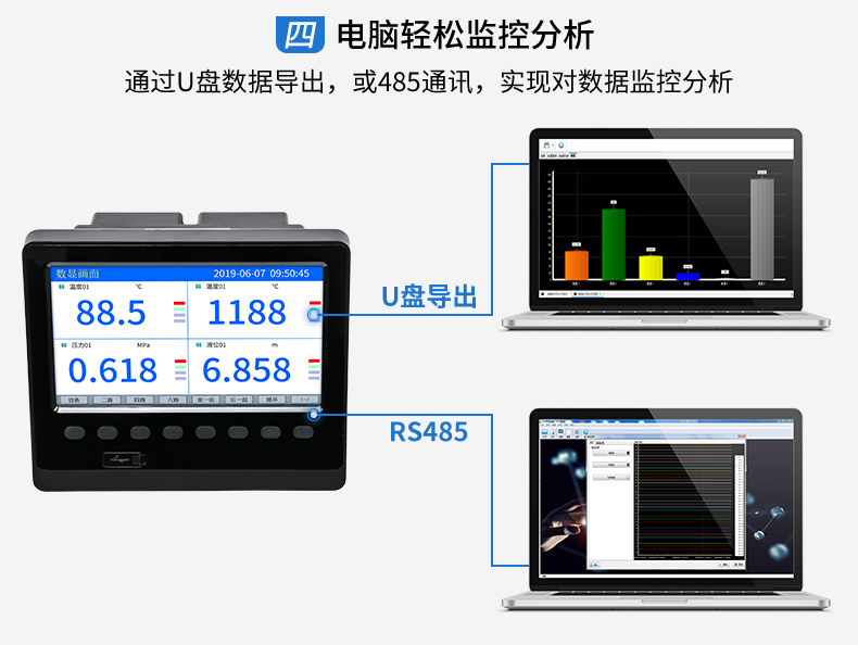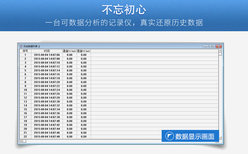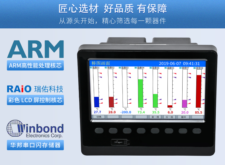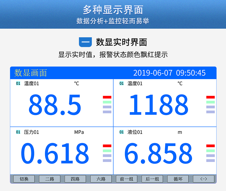 無紙記錄儀是將采集的數(shù)據(jù)/運算數(shù)據(jù)以時間為基軸記錄在儀器內(nèi)部的存儲系統(tǒng)中,無消耗任何常用的記錄設(shè)施,如:紙張、筆墨。記錄在儀器內(nèi)部的存儲數(shù)據(jù),通過運算、模擬后顯示在液晶屏。常用顯示用液晶屏比較廣泛。在液晶屏屏幕上,可以顯示數(shù)字顯示、棒圖顯示、曲線顯示、報警列表等。無紙記錄儀采集的數(shù)據(jù),常用的有:溫度、壓力、流量、液位、電壓、電流、濕度、頻率、振動、轉(zhuǎn)速等。
